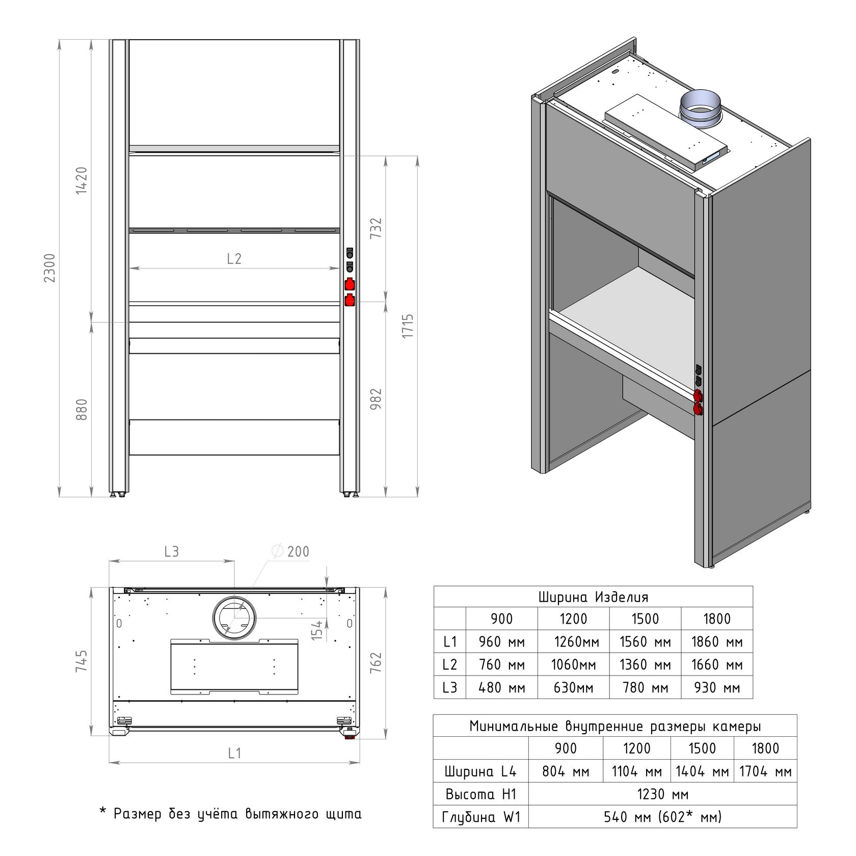 Shkafning egzoz kamerasi (yuqori qismi) polimer qoplamali po'latdan yasalgan. Ish xonasida uchta egzoz zonasi mavjud - ish hajmining yuqori qismida, o'rtasida va pastki qismida. Pastki qismi - kulrang polimer qoplamali bardoshli metall ramka. Ramka sirt notekisligini qoplash uchun 0-30 mm oralig'ida sozlanishi tayanchlarga ega.