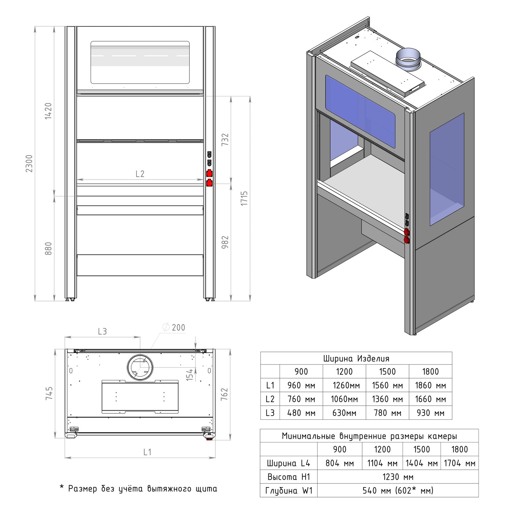Shkafning egzoz kamerasi (yuqori qismi) polimer qoplamali po'latdan yasalgan. Ish xonasida uchta egzoz zonasi mavjud - ish hajmining yuqori qismida, o'rtasida va pastki qismida. Pastki qismi - kulrang polimer qoplamali bardoshli metall ramka. Ramka sirt notekisligini qoplash uchun 0-30 mm oralig'ida sozlanishi tayanchlarga ega.